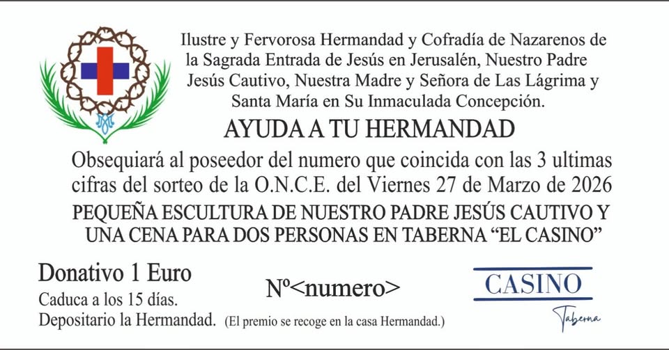 Ya están a la venta nuestras papeletas para el sorteo de una pequeña escultura de Ntro. Padre Jesús Cautivo y una cena para dos personas, que podrás comprar a cualquier miembro de la Junta de Gobierno, camareras, costaleros, grupo joven o en la Farmacia de Puerta Osuna. Participa y ayuda a tu Hermandad.
