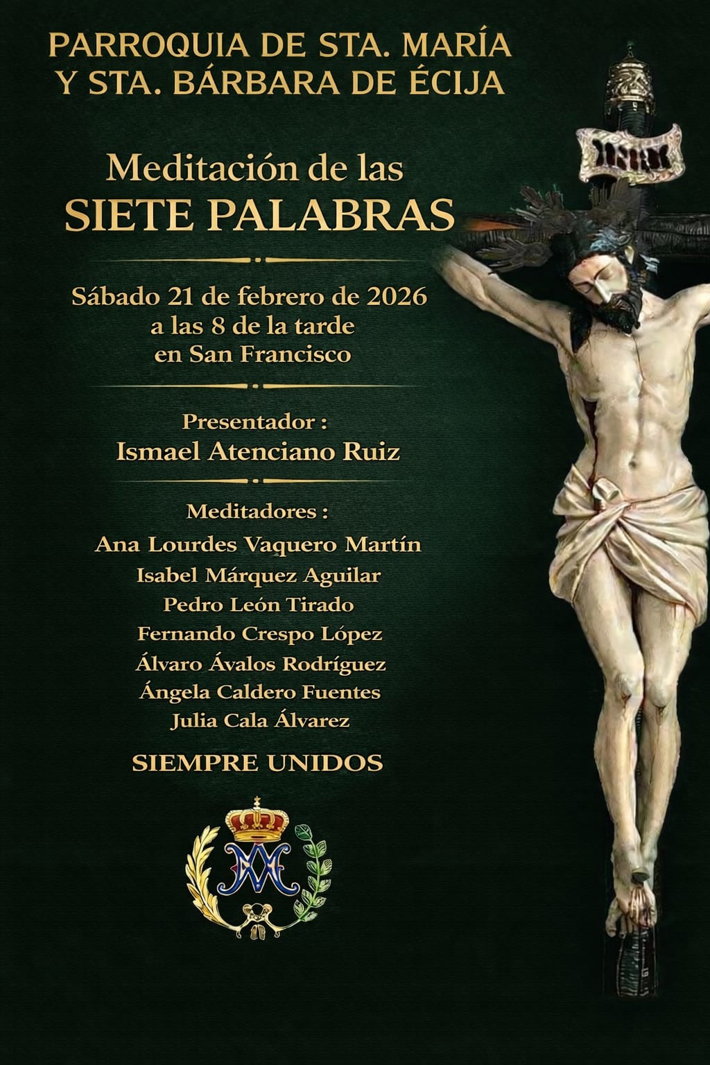 La comunidad Parroquial de Santa María y Santa Bárbara, a través de su Párroco D. Rafael Calderón García, organiza la Meditación de las SIETE PALABRAS de Cristo en la Cruz, y en el cual participa nuestra Hermandad.