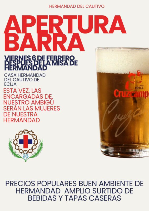 Viernes 6 de febrero, primer viernes de mes, se celebrará Misa Mensual de Hermandad a las 7 de la tarde, ante el altar de Nuestro Padre Jesús Cautivo.