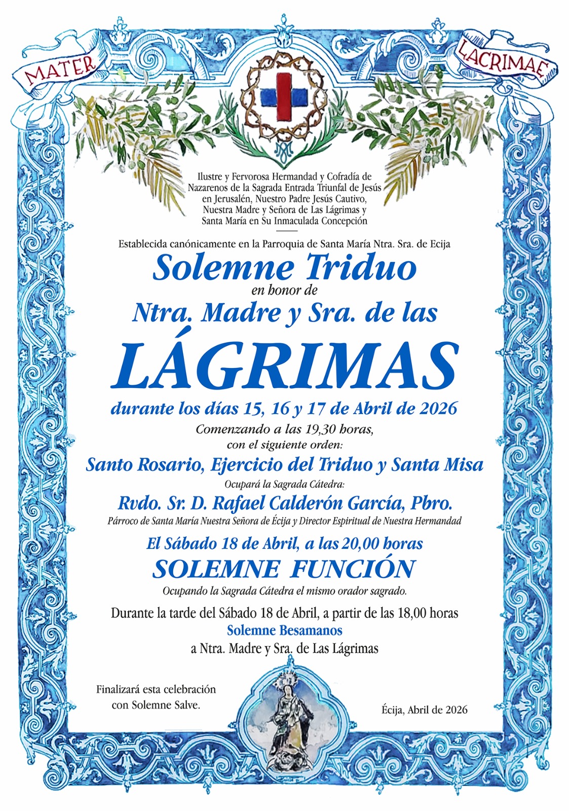 Triduo Virgen de Las Lágrimas Triduo a Nuestra Madre y Señora de Las Lágrimas Fecha publicación 11 de abril de 2026 Publicada en Actualidad Entrada anterior: Horario e Itinerarios 2026